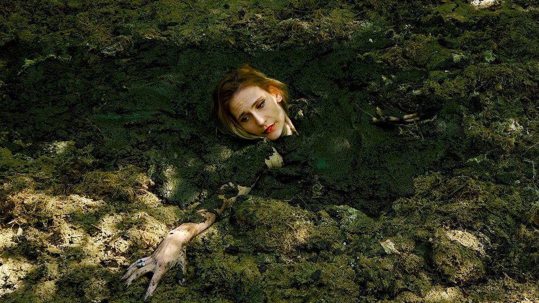 Lucy stumbles upon a mud bog in the middle of the forest. It's covered in something yellowish-green, like moss and rotting grass. The loose, bottomless, brownish mud sucks Lucy down inch by inch as she struggles. Inevitably, she ends up completely below the surface.
